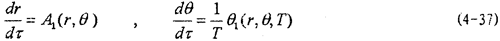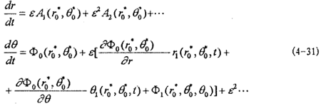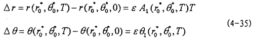 这就是对应于(4-2)式的频闪差分方程,即(4-2)式在Poicare平面上以T为周期的点变换方程。如ε充分小,则可令△τ=dτ,△r=dr,△θ=dθ,此外,(4-36)中的