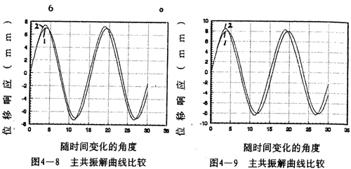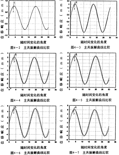 =2时两者的重合性很好。(2).随着振幅的增大,解析解曲线1和仿真解曲线2在相位上产生微小变化,解析解的相位超前仿真一个小量,原因是随着振幅的增大,系统呈现更为强烈的非线性,而在推导中略去了高次项,但还是可以满足工程的要求。(3)从(4-78)-(4-85)式中的各δ值可知,在联轴器产生主共振的情况下,激振力很小。