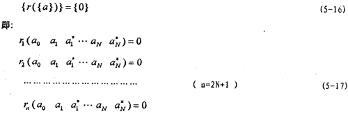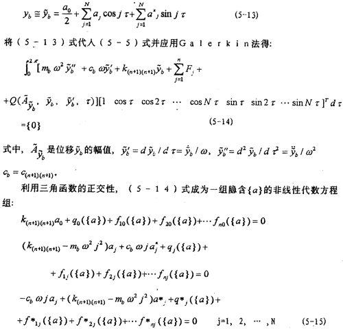 由以上推导可知,求解带有非线性联轴器轴系的稳态响应,可以归结为联合求解2N+1个非线性代数方程组(5-15)和求解n个微分方程组(5-4)而重点又在于由(5-15)式求得2N+1个未知量[a0  a1   … aN  T。由(5-15)式可知,它不同于一般的非线性方程组,在一般的非线性方程组中,未知量是显含的,而(5-15)式的未知量{a}是隐含的,而且{q}是{a}的非线性函数。不能通过将yb的傅立叶展开式代人恢复力Q的表达式中来直接求得,这是因为Q表达式中的振幅不能表示成{a}的显函数的缘故。此要想由(5-15)式解得{a},还需要解决两个问题:一是如何求,τ),二是用什么来解隐含{a}的方程组(5-15)。下面就来解决这些问题。
