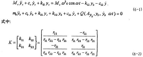 圆盘2安装在转轴两支承1的中间位置,轴3一端由具有非线性特性的联轴器4与电动机5联结。转轴的两个支承1中的轴承为双列向心球面球轴承,轴可以在轴承内自由偏转。圆盘靠轴套与轴相联,由于轴套有一定的长度和直径,它对转轴柔度及刚度均有影响,但影响有多大,有待实际计算中考察,故在此先视转轴为一变截面(阶梯)细长轴。同时考虑转轴质量对轴系固有频率的影响。根据第五章建立轴系力学模型的原则,可以将图6-1所示轴系处理成为两个自由度系统,然后根据第五章的式(5-4)、(5-5)可以写出转子轴系的振动微分方程式: