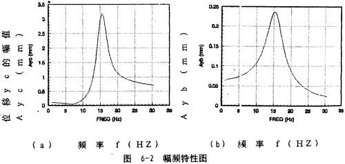 从图6-2(b)可以知道,联轴器从动端质量块mb的位移幅值Ayb从1赫兹开始随频率增大而迅速增大直至轴系的一阶固有频率15.2赫兹,然后随频率增大而迅速减小,在一阶固有频率处达到最大值。