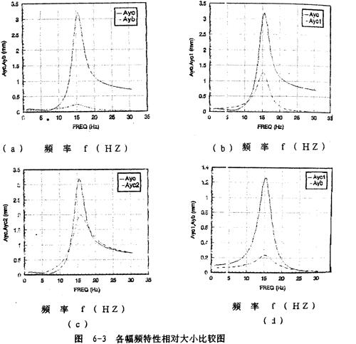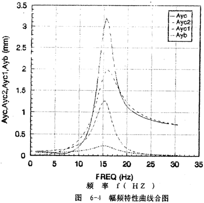 yc2的幅频特性如图6-2(d)所示。Ayc2从1赫兹开始随频率的增大而迅速增大,在轴系的二阶固有频率15.56赫兹处达到最大值,然后随频率增大而减小并趋于某一定值,Ayc2随频率变化的规律反映圆盘仅在质量偏心激励下,而轴系没有钢丝绳联轴器影响时圆盘的幅频特性。考虑上联轴器对圆盘幅频特性的影响部分Ayc1(图6-2(c)所示部分),则圆盘的幅频特性即为图6-2(a)所示。由此可见,钢丝绳联轴器在频率的较低段(0~11赫兹)对圆盘振动有抑制作用。值得一提的是Ayc不是Ayc1和Ayc2的简单相加,而与各频率对应的向量{a}中17个元素以及相位有关。