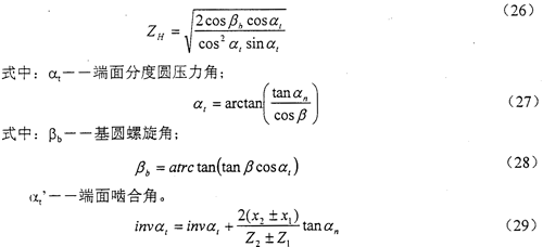 节点区域系数ZH是考虑节点处齿廓曲率对接触应力的影响,并将分度圆上切向力折算为节圆上法向力的系数。ZH数值可由式(26)计算得出。