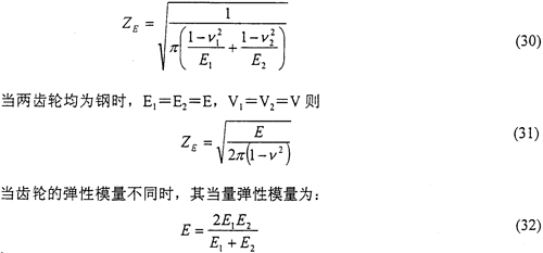 弹性系数ZE是用以考虑霉烂弹性模量E和泊桑比v对赫兹应力的影响。其数值可按实际材料弹性模量E和泊桑比v由式(30)计算得出。