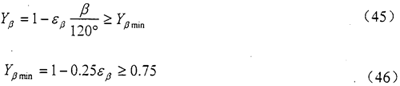 螺旋角系数Yβ是考虑螺旋角造成的接触线倾斜对齿根应力产生影响的系数。其数值可以通过式(45)和(46)计算。