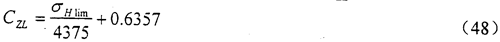 其中,在850N/mm2≤σH1im≤1200N/mm2范围内,CZL可由式(47)算得。当σH1im<850N/mm2时取CZL=0.83;当σHlim>1200N/mm2时取CZL=0.91