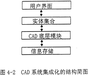 集成化CAD系统,从系统的整体结构上,在CAD系统的UI之上,建立集成化后工程实体的UI,通过UI进一步调用集成后的对实体操作的UI。在AUTOCADRl4的面向对象的集成开发,引入了ObjectARX技术,增加了对“类”的全面支持,应用了具有面向对象技术中“类”特性的实体模块,将所有操作集成在若干类的函数或方法里,其体系结构简图见图4-2。面向对象的CAD集成软件主要包括了实体核心模块、信息存储模块和用户界面模块。其中,实体核心模块是最主要、最基础的模块,是它对CAD系统进行彻底的封装,使得系统在用户面前体现的不再是简单几何的点线圆,而是一个个工程实体;同时,它也是不同行业对CAD不同集成要求的具体体现。