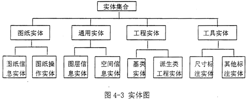 在面向对象的CAD集成开发系统里,系统数据模型的基本元素就是ARX开发语言中的(多是C/C++语言)类,类实例化后称为对象或实体,整个图纸就是一个实体集合,主要由四大块组成:图纸实体集合、通用实体集合、工程实体集合和工程实体集合。其中,图纸实体、通用实体和工具实体都为独立类,没有父类或子类;而工程实体集合中的各工程实体是由具有基本特征的基类实体派生而来,具有一个基类和若干个派生类,并且各实体集之间互相独立(如图4-3所示)