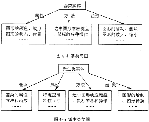 对于以上的问题,第一,要对行业的需求十分清晰,能够对行业中涉及到的工程实体进行归纳,要具有“面向对象”的编程思维;第二,基类涉及的属性方法和函数基本上与实体图形的操作有密切关系(如图4-4所示);派生类主要涉及到工程实体的特征属性、特征方法和特征函数(如图4-5示),完整地定义其基类和派生类是“面向对象的CAD集成开发系统”中的核心部分;第三,要充分的利用AutoCAD已提供的资源,主要就是要利用AutoCAD系统中的*,dwg文件的图形文件数据库中的资源,熟悉各种AutoCAD中实体(例如点、直线、圆弧等)的DXF码规则,并从中提取相关特征信息;第四,由于在AutoCAD中的.dwg文件中,存储的是一些简单的几何的点、直线、圆、弧等信息,故还需要另一个文件去记录整个图纸的工程实体图形的逻辑关系(下一节详细介绍),随同*.dwg文件的打开而打开,标识*.dwg文件图形中的实体图形逻辑关系,随同*.dwg文件的关闭而记录*.dwg文件中的实体图形逻辑关系。