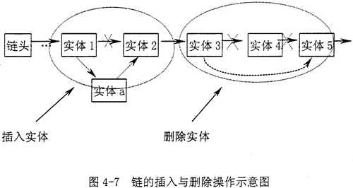 用户对实体进行查找、移动、旋转、删除等操作,系统首先要在整个图纸中搜索该实体,因而,系统必须对整个图纸的实体的综合信息进行存储,多采用链式结构,设置一个链头和一个指向当前实体的指针。采用链式结构的原因是它很方便进行查找、插入、删除,效率高,简单明了。(见图4-7)