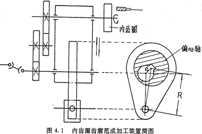 目前,在推杆减速器的批量生产中,其内齿圈齿廓的加工采用的都是范成加工方法,加工的夹具及刀具的相对运动完全模拟减速器的运动。激波器的偏心距e由一个偏心轴的偏心距e来实现,激波器的半径Tb与内滚子半径Tz之和由偏心轴的几何中心至固定点的距离R来实现,传动比由挂轮的传动比来实现,如图4.1所示。