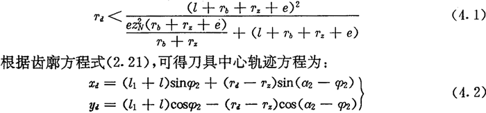 由上面可知,用数控加工齿廓时,应求出圆插刀中心的轨迹,它是被加工内齿圈齿廓曲线的内法向等距线,如图4.3所示。圆插刀的半径可不等于实际推杆减速器中滚子的半径,只要刀具半径Td小于内齿圈齿廓在齿根部的最小曲率半径,在加工过程中不会发生切削干涉即可。对于激波器为偏心圆的推杆减速器,根据(2.35)式,可得不发生切削干涉的条件为: