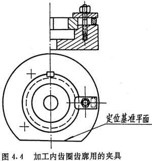 内齿圈齿廓的数控加工,是在齿圈外径及两端面都精加工后进行的,因此,应以端面及外径作为定位基准。其夹具可做成螺钉压板结构,如图4.4所示。夹具内径应尽量接近齿圈外径,用千分表以夹具内圆为基准找正工作台轴心。