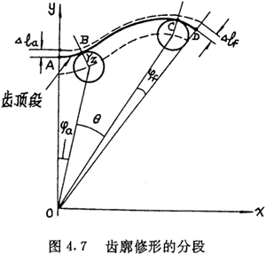 分段修形法是为了达到较理想的修形状态而提出的一种能够在数控加工中实现的齿廓修形方法。它根据修形后要达到的目标,将齿廓分成三段,如图4.7所示,在工作段BC内只进行微量的等距修形,在齿顶段AB及齿根段CD内同时进行等距△Tz和移距△l增量函数修形。