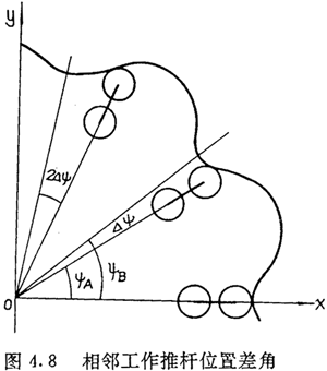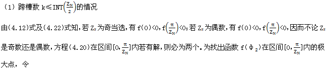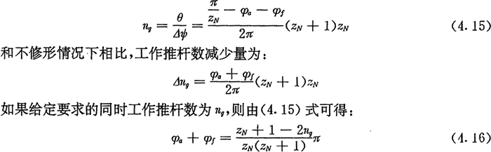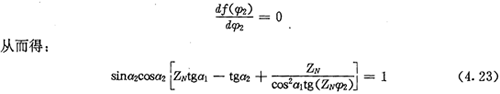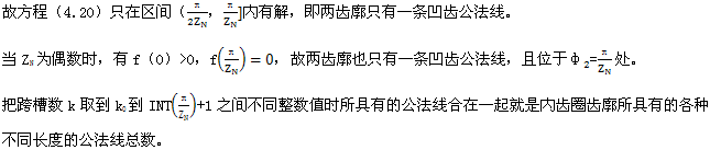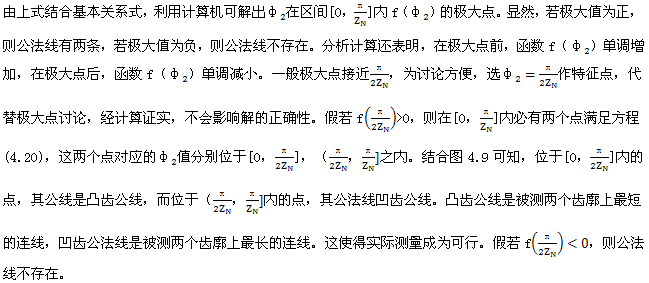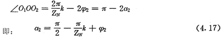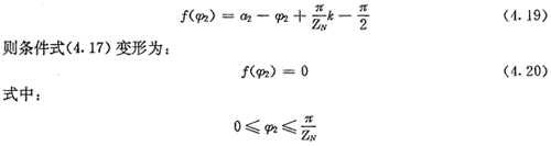 上式就是齿廓AB上与跨槽数为k的齿廓具有公法线的点的条件。当k确定后,若存在公法线,则由(4.17)式并结合基本关系式(2.38)等可解出φ2的值来。