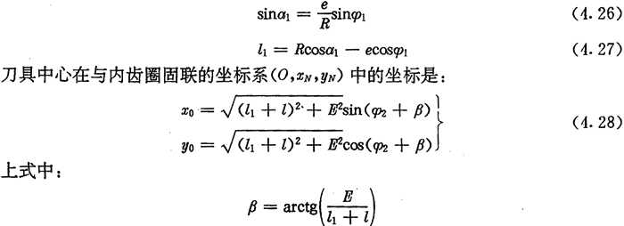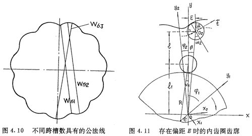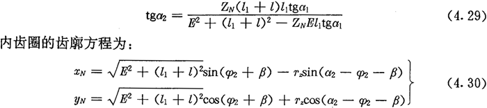若令(4.30)式和(4.31)式中的E=0,得到的就是无偏距时的内齿圈齿廓理论方程式(2.21)及公法线长度(4.18)式。