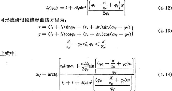 显然,未经修形的齿廓曲线在齿顶邻域和齿根邻域啮合的压力角都很小,因而分段修形后应将顶、根部大致削去相同的区段。即φa、φf仰的分配应根据各自所对应的顶根段曲线弧长相等的原则来进行。一般可近似取φa为φf的2到4倍,而取△la=△lf=esinφa。