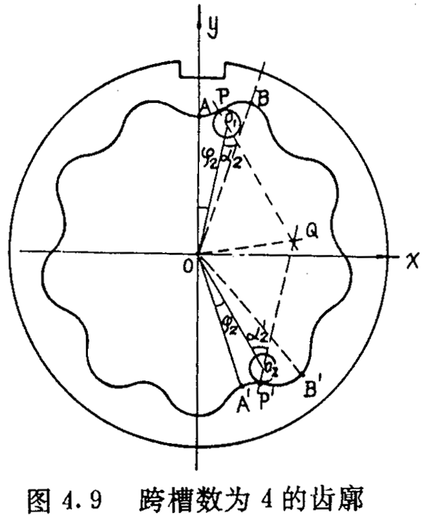 如图4.9 所示,AB是其中一个齿槽的一侧齿廓,A′B′是跨槽数为K(图中k=4)的一个齿梢的另一侧齿廓,它们是两个性质不同的齿廓。若把AB看成是工作齿廓,则A′B′是非工作齿廓。选择图4.9所示的坐标系,让坐标原点O与内齿圈几何中心重合,y轴与OA重合。设P(x,y)为AB齿廓上的一点,在P点与内齿圈齿廓相接触的外滚子的位置角为φ2,在A′B′上取P点的对应点P′,使∠A′OO2=φ2,P′点与P点是关于∠AOA′的平分线完全对称的,即0P′=OP,a2=a2′,OO1=OO2,图4.9中PO1与P′O2相交在Q点,它们并不共线,因此P′点与P点不具有共同的法线。假设随着P点位置的改变(当然P′点也随着P的改变而改变),使PO1与P′O2在同一条直线上,此时P′与P就有共同的法线,此时: