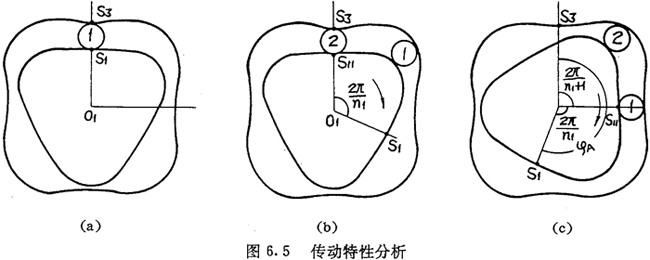 固定内齿圈,当太阳轮起点从初始位置开始转动到与行星轮重新在初始位置接触时,太阳轮转过的圈数与行星轮公转过的圈数之比ip12称作太阳轮与行星轮的均传动比。图6.5(a)为初始位置,图6.5(c)为太阳轮按顺时针方向相对行星轮1转过一个周期后的情形。此时内齿圈相对该行星轮也应转过一个周期,即行星轮1从初始位置公转过的角度为:
