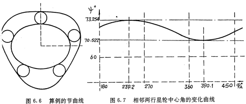 节曲线形状如图6.6所示。图6.2为该轮系加上轮齿后的情形。按(6.34)式可算得相邻两行星轮之间的夹角随φA的变化规律,其关系曲线如图6.7所示。由曲线图可看出,当φA=239.2°时,夹角ψ有最小值ψmin=70522°,夹角ψ的变化范围是2.732°。