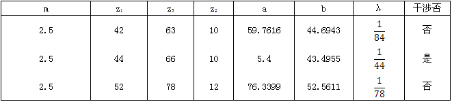 从(6.37)、(6.38)、(6.43)三式所组成的方程组中,解出a、b及z2,将齿数代入( 6.40)便得到临近发生运动干涉时的λ值。因为z2是整数,当m给定后,由上面三个式子所组成的方程组一般是无解的。若把m也作为一个参变数,这时方程有解。