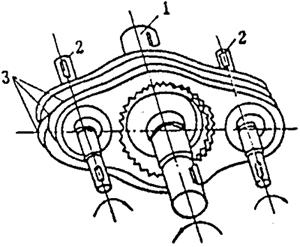 三环减速器是一种利用三相并列双曲柄机构来克服死点的连杆内齿行星齿轮减速器,其基本结构如图5-0所示。它由低速输出轴1 ,两根高速输入轴2 ,三片传动齿板3组成,各轴均平行配置,相同的两根高速轴带动三片传动齿板呈120°相位差作平面转动,传动环板上的内齿圈与低速轴上的外齿轮相啮合,形成大速比,其传动比