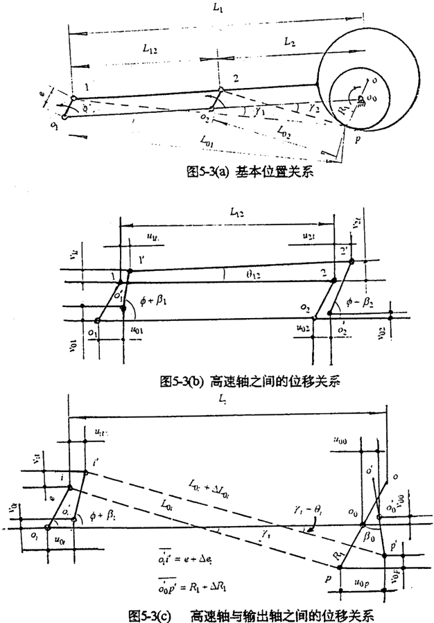 三环减速是多相并列连杆行星齿轮传动过约束机构。应该从整体系统上去考虑其变形关系。图5-3是一相子机构的位移关系图。图5-3(a)是基本位置图、图5-3(b)是高速轴之间的位移关系、图5-3(c)是高速轴与输出轴之间的位移关系(i=1、2)。由图写出各运动副中心的位移关系如下: