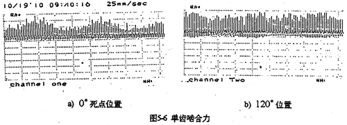 理想情况下,啮合力的极小值在φ=0°、180°产生,极大值在φ=90°、270°产生,造成位置偏离的影响因素主要有轴承刚度,齿板刚度,啮合角以及输入转速、传动比等等。其中轴承刚度的影响极大。在死点的啮合力也产不并一定为零。哈合力可能为负值。为负值时,将阻碍传动的正常转动,产生内齿轮副的干涉现象。并引起减速器冲击振动。因此,按照啮合力过死点时为零的假设分布规律以及啮合力为常数分布规律的模型分析,所得结果都是不可靠的。图5-6是齿板死点位置180°及另一齿板位于超前120°啮合点的单齿啮合图的测试结果。图中每一棒线代表被测齿受啮合力作用一次。比较两图可知,死点位置啮合力总体水平低于120°位置时的啮合力总体水平,与理论分析计算的结果完全吻合。