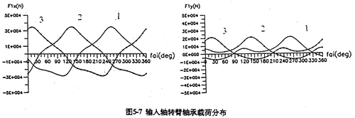 4.输出轴的行星轴承总体载荷比支承轴行星轴承总体载荷大(图5-9),特别是输入轴X方向受力最大。输入轴行星轴承载荷在死点附近取得最小值,在φ=105°、255°取得极大值。极大值产生的位置正好是机构传动角最佳位置附近。在同一时刻,齿板上各输入轴行星轴承的受力状况是不是一样的。当某一齿板接近其死点位置时,轴承载荷较小,而同时另外两片远离死点位置的齿板上输入轴行星轴承载荷要大得多。支承轴的轴承载荷在一个周期内分别出现三次极大值和三次极小的值。由于这个原因使支承轴偏心套的微动磨损比输入轴偏心套的微动磨损更为严重。行星轴承载荷的最大值为