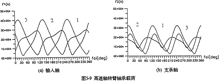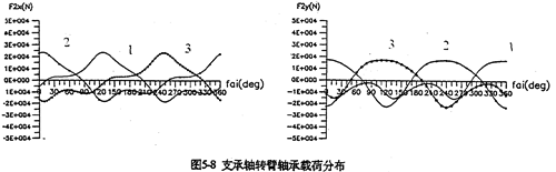 3.由图5-8可知,支承轴行星轴承在过死点时的y向轴承载荷(切向力)并不为0,说明某相机构在过死点时,是由其它两相机构通过支承从动轴传递扭矩带动该相机构通过死点的。因此,孤立地分析研究一相子机构将偏心套简化为二力杆件建立的模型是不可靠的。
