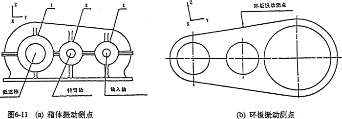 为了将理论分析的结果与振动测试分析结果对比印证,将测点选在三个箱体轴承座及齿板支承轴孔的上边缘,如图6-11所示。