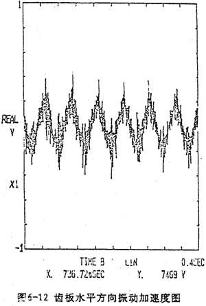 由于机构过死点时,因变形要引起死点冲击,可以通过死点位置及其附近的轮齿(齿板)进行修形,使三相载荷均衡化。图6-23是将死点位置轮齿修形后,轴承座的振动加速度图。与图6-21(a)比较,总体幅值明显下降。