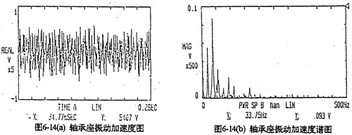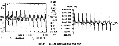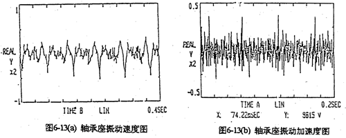 由于每片齿板都存在同样的周期性激励冲击函数,相位差120°,迭加后的总效果仍然是转频周期函数。因此对箱体轴承座的冲击也呈周期性。图6-13是支承轴箱体轴承座的振动速度及加速度的实测时域曲线图。其曲线图的变化规律及幅值与图6-4完全接近。速度及速度冲击值为v
