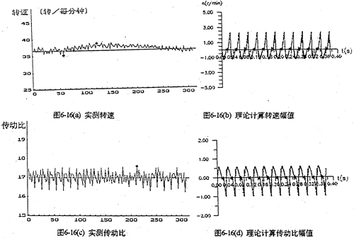 由于机构的变形及误差等原因,将使输出转速及传动比动变化,冲击箱体、产生振动。图6-16是对SHLEO15型三环减速器实测及理论计算的转速和传动比随时间变化的波动曲线。输出转速对比为