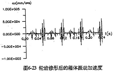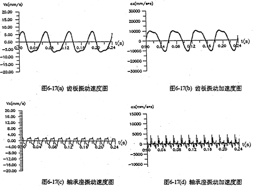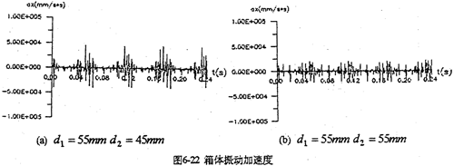 增加高速轴的刚度是降低冲击载荷的重要途径。轴的刚度大(值径大),扭转、弯曲变形小,双曲柄机构变形也就小,这样既减小了冲击振动、又增加了轴的强度。图6-22将高速轴的直径由原来的45mm加到55mm后的,振动加速度图。