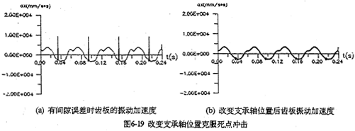 在上一章已经分析过,当三轴水平布置而且高速轴在输出轴的同侧时,载荷幅值最大,各相啮合力等都很不均衡(见图5-24)。图6-19是将支承轴布置在输入轴与输出轴间的150°位置时齿板的振动加速度。由图可知,因误差引起的冲击已被完全克服,而且原有的稳态幅值也降低了很多。