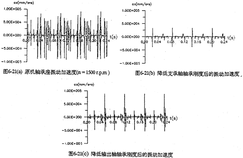 降低箱体轴承刚度是为了吸收内部机构对箱体的冲击振动,减小冲击幅值。图6-21是转速为1500(rpm)即时分别将支承轴及输出轴的箱体轴承与轴之间加一3mm的弹性垫圈时,计算出的箱体振动加速度曲线。从图中看出,减小支承轴箱体轴承刚度比减小输出轴箱体轴承的效果更明显。