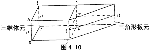 当然,在三维体元和三解形板元的边界对接上是有很多种方法的,为了确保我们这种对接方式是最为有效、可靠的,我们做了大量的计算工作,尝试了诸多对接计算模型的验算,最后得出结论,只有上图所表示的接法才能够保证在载荷相同的情况下(即原载荷加在板元上,现在加在体元上),板元内部各点上所受力、力矩的方向和数量级才能保持一致,其余的各种方法,要么是力的数量级别产生较大差异,要么是力、力矩的方向发生变化,由此使我们最后认定以图4.3.2所示的对接方法是可反映实际情况的,后面将计算结果与实验数据相印证也证明了这种方法的可行性。