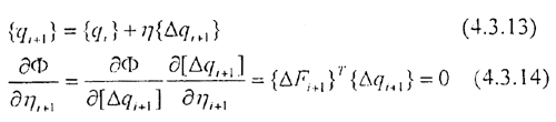 在求解方程(4.3.8)时,,寻求一个n 阶矢量{q } ,实际上是在n 维空间找到一个方向和步长来满足该方程。对于非线性方程组,要经过多次迭代,每次迭代均要找到一个方向和步长,逐步达到平衡解,为了加速迭代的收敛,在由式(4.3.12)决定的力向上寻求一个优化的步长,即将{△q}乘以某一标量η而使迭代加快。决定η 的原则是使能量增量φ最小化,即:
