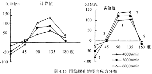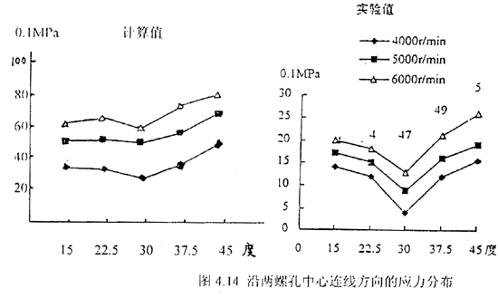 以上两图所示的实验数据与计算数据之间有一定的偏差,这是由于从计算模型上取的点与实验点并不能完全重合,因而产生一定的误差,排除这些因素,我们可以看出,随转速的增大离心力相应增大,沿螺孔圆周方向应力中最大应力出现在靠近X轴的孔边附近,在两螺孔连线上靠近螺孔处的应力大,中间小,这些表明离心载荷下计算结果与实验结果的规律符合较好。