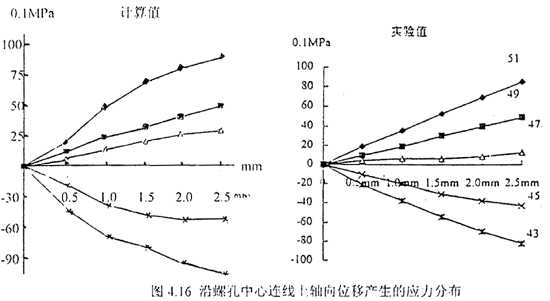当我们给定计算模型中三维体元上各点一个相同位移δ时,所得到的两螺孔中心连线上点的应力分布图如上所示,由图可知,计算值与实验值符合较好。