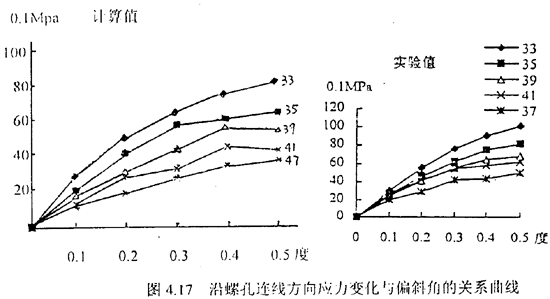 角向位移与轴向位移之力学模型的区别是角向位移时螺孔处各点的位移量是不相等的,也属于几何非线性问题,由图可知,计算值与实验值是符合的,随角向位移的增大应力非线性增大。