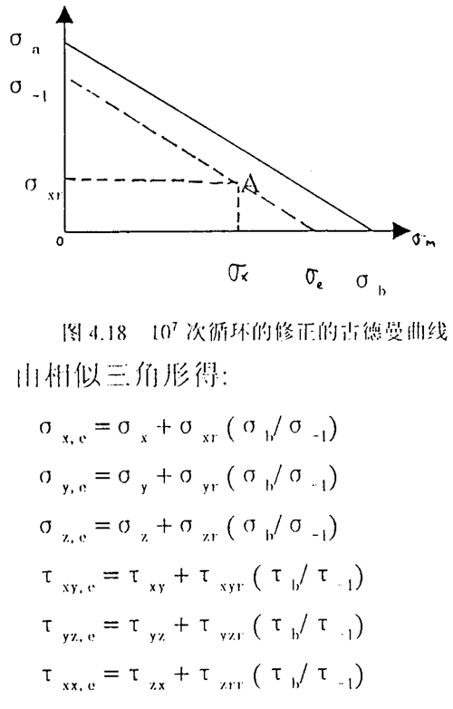 求出各应力分量的当量稳态应力后,即可用歪形能理论求出当量稳态应力σe,在直角坐标中,当量应力表达式为: