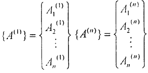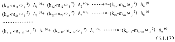 求得各阶固有频率ωni后,将方程5.1.6划去其中不独立的某一式,并将剩下的n-1个方程中的某一相同的Ai项(这里取最后一项),移到等式右边,把某一ωnj2的值代入ω2后,得如下方程组: