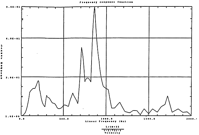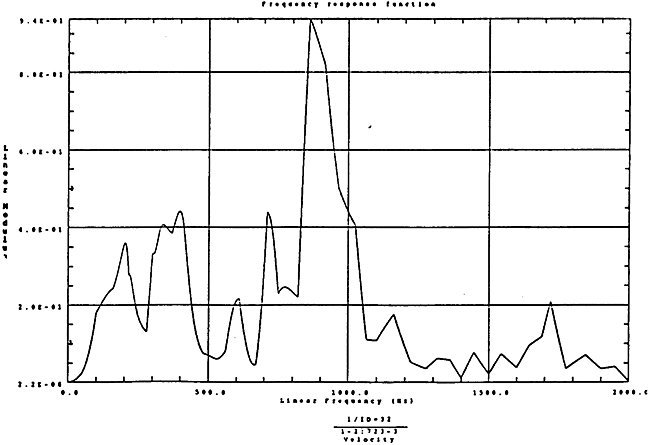 在如图4-13的1000rm-3350kgm工况下的载荷谱的激励作用下,SHQ40振动系统测点2、5、8Z向振动速度的幅值谱函数如图5-13、图5-14和图5-15所录,图5-16、图5-17和图5-18为其相应的时域波形。振动速度的预估值与试验的实测值(如表6-12)对比见表5-1所示的工况三。