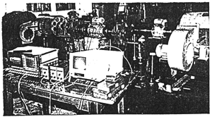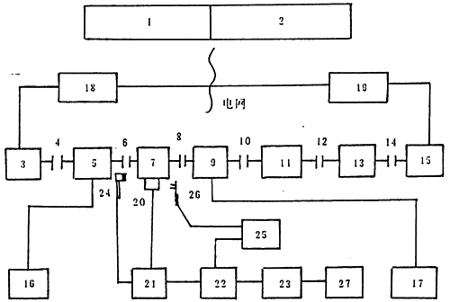 试验时,通过控制台1,2调节控制系统让交直流机组18发出适当的直流电压使直流测功机3(工作于恒速电动工况)按恒定转速转动,通过联轴器4,6和输入转速扭矩传感器5与试件7输放端(高速端)相联接。试件7输出端通过联轴器8,10,12,14及输出扭矩传感受器9、升速用11、汽车变速箱13而与直流测功机15(工作于恒电流工况)联接,驱使其发出适当电压的直流电,再通过交直流机组19将其逆变成为工频北流电返回电网,完成整个电功率封闭闭链。