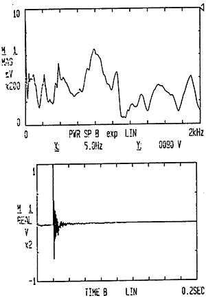 试件7上的振动信号与脉冲激励的响应信号通过传感器20取出信号,然后经过放大器21放大后,用磁带记录仪22记录并可采用频谱分析仪23监控并分析,而其上的噪声信号可以通过声强仪25的测头26取出信号后送入22和23中用于分析研究。