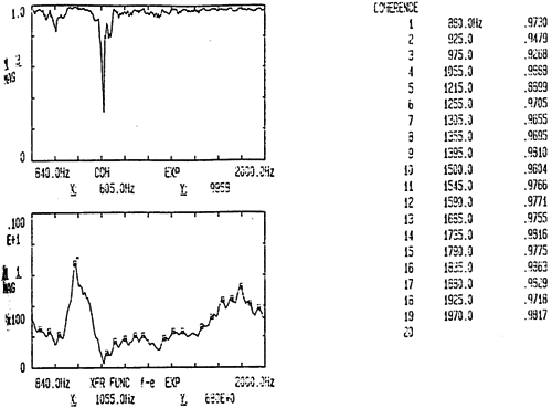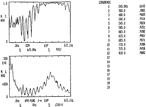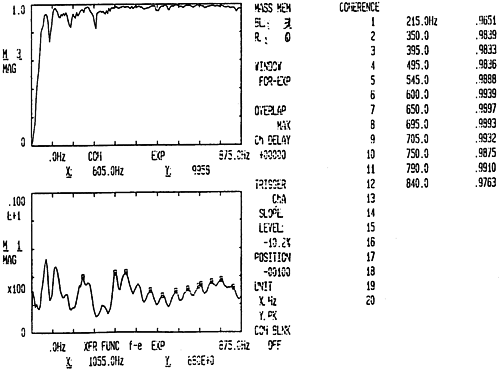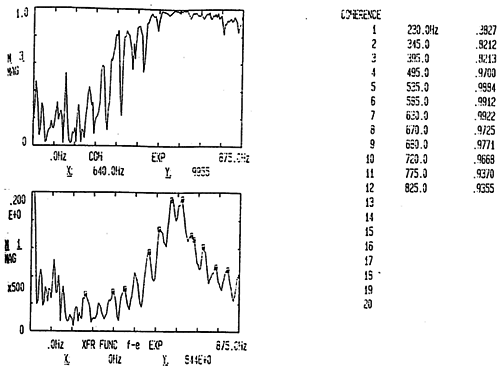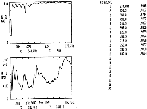 下面我们列出SHQ40振动系统850HZ-2KHZ间各阶模态固有频率的试验值。如图6-13示。图中左上部为相干函数,左下部图为频响函数图,而右半图部分为十三阶到三十一阶固有频率值及其相干值。