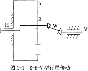 本文所研制的两级三环减速器属渐开线少齿差传动形式,有必要重点讨论一下渐开线少齿差行星齿轮传动。当渐开线内啮合圆柱齿轮副的内齿轮和外齿轮齿数差很少时(一般为1~4个)所组成的行星齿轮机构,称为少齿差行星齿轮传动。如图1-l所示的K-H-V型(也称N型)是其主要形式,K-H-V型传动,其内齿圈b固定,转臂H是输入轴。由于它的转动和内齿圈的限制,行星轮g作平面运动,即行星轮既绕内齿圈轴线作圆周平移运动,又绕自身轴线作回转运动,再用输出机构W把行星轮的回转运动传递给输出轴,从而起到减速作用。