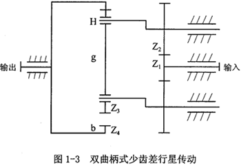 RV传动作为一种新型传动,由于具有良好的动、静态特性,对其进行的研究和应用较为广泛。双曲柄式少齿差行星传动则将输入运动和输出运动分别由中心轮和行星轮承担,如图1-3所示。该机构一方面省取了输出机构W,避免了由输出机构所带来的弊病,另一方面用一个平行四边形机构(双曲柄)代替了转臂H,设置了同步啮合的定轴齿轮副,经减速后再将运动输送给少齿差轮系,这样可获得更大的速比,使机构更为紧凑和有效;当总速比相同时,动轴上齿轮的转速较低、运转比较平稳、动载荷和噪音较小。